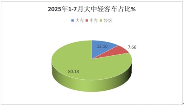 从市场占比看,今年前7月大中轻客车销量占比分别为12.16%、7.66%和80.18%。
