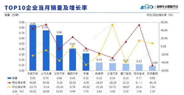 ---前10车企销量同比5增5减,其中大通同比增长54.92%领涨前10企业,表现抢眼;环比4增6降,其中江淮汽车领涨(环比增53.72%)。