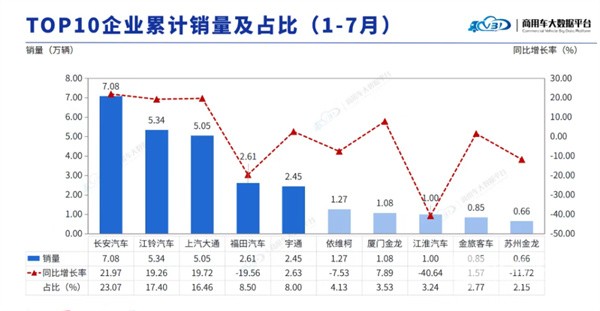 特点六、前7月累计:长安、江铃、大通居前三,江铃领涨