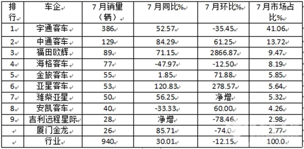 7月新能源座位客车:销940辆增3成 中通\欧辉分列二三 亚星领涨