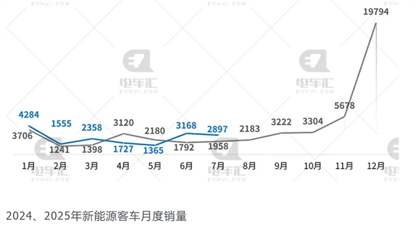 截图1,2024年—2025年7月各月新能源客车终端销量(数据来源:电车汇提供的终端上牌信息)