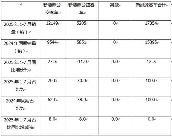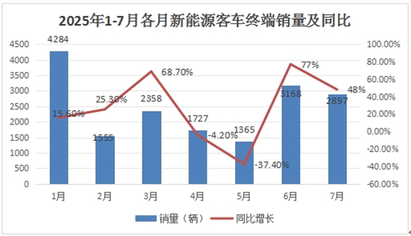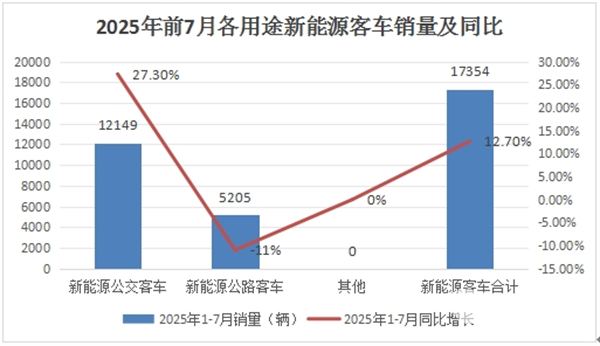 2025年1-7月新能源客车累计17354辆,累计同比(去年同期新能源客车终端累计销量为15395辆)增长12.7%,累计同比增速比今年上半年的7.6%扩大了5.1个百分点,持续向好趋势明显。