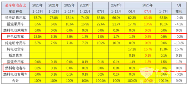 四、2025年前7月各技术路线新能源客车装机量同比及占比: