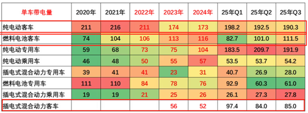 截图4,2025年前7月及近6年各类新能源客车单车平均带电量比较(数据来源:中国汽车流通协会提供)