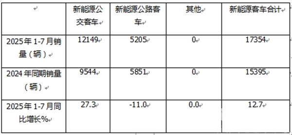 终端上牌数据显示,2025年前7月国国内新能源公路客车实销5205辆(含5米以上新能源公路客车),同比下降11%(见表3),可见今年1-7月新能源公路客车市场比较乏力。