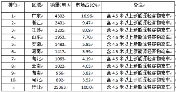 上表可见,在2025年7月国内新能源轻客物流车区域流向中,广东、浙江、江苏居前三,其挂牌销量均在2000辆以上。其中广东独家销量超4000辆,居榜首;山东、安徽、河南、湖北、云南、湖南、河北分别位居第四---第十名。
