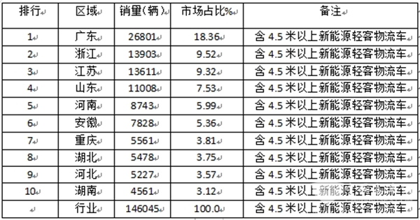 三、2025年7月国内新能源轻客物流车区域流向前10销量及占比统计