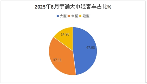 大中型客车依然是主体部分。2025年8月份,宇通大型客车销量占比为47.93%,相对之前几个月均超50%的份额有所缩小,也是近几个月来第二次份额没有过半的月份(第一次是7月);中型客车销量占比为37.11%,居第二,是近几个月来首次占比超三分之一的月份;轻型客车销量占比为14.96%,居第三。