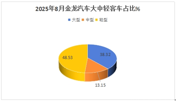 ---从产品销售结构来看,2025年8月份,金龙汽车轻型客车销量最多(占比48.53%)领跑,成为2025年8月金龙汽车市场的主体部分;大型客车销量占比38.32%居第二,中型客车占比13.15%,居最小;