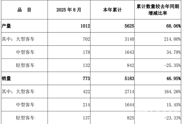 近日,中通客车发布了2025年8月份及1-8月产销数据快报。