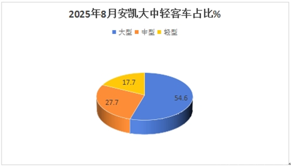 ---从产品销售结构来看,2025年8月份,安凯大型客车销量最多(占比54.6%),成为2025年8月安凯客车市场的绝对主体部分;中型客车销量占比27.7%居第二;轻型客车占比17.7%,居最少;