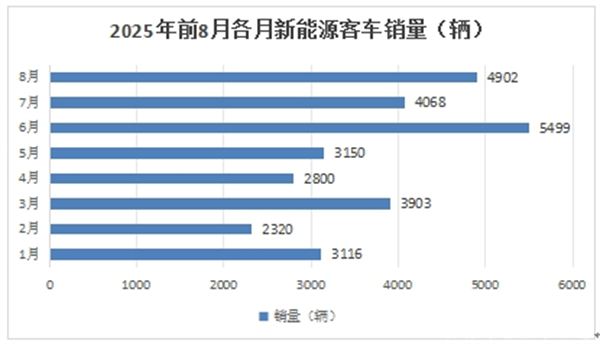 根据中国客车统计信息网数据,2025年1-8月各月我国大中型新能源客车销量: