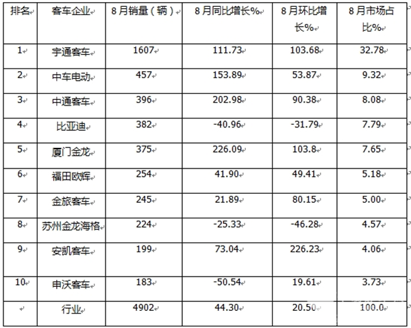 8月新能源客车:宇通\中车\中通居前三 金龙\安凯分别领涨同环比