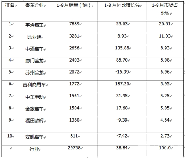 ---比亚迪客车累计销量3281辆,居第二,同比增长8.93%,跑输大盘;市场占比11.03%;
