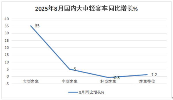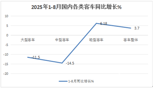 总之,在2025年1-8月国内客车市场中,轻客同比唯一增长领涨,中客同比领跌。