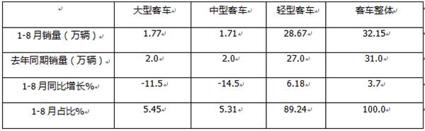 一是在高铁、航空及私家车等多元交通工具的挤压下,国内公路客车“大转小”趋势明显,特别是5-6米轻型公路客车成了市场需求的重要车型,因此推高了今年前8月轻客的销量;