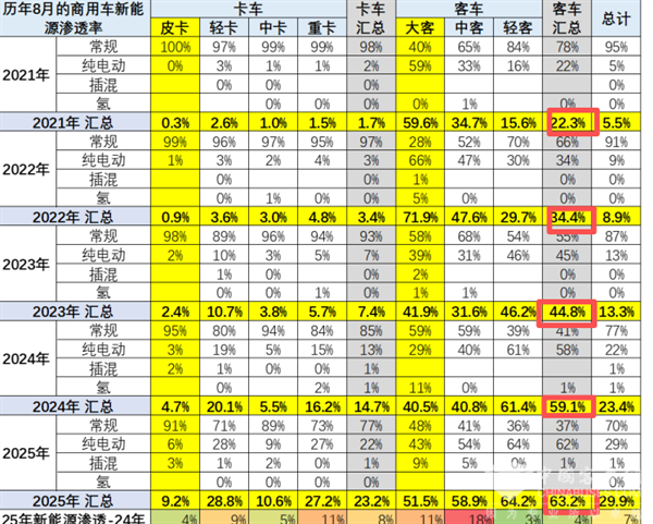 根据中国汽车流通协会提供的上牌信息(具体见截图1)可知,2025年8月国内大中轻客车各车型新能源化率: