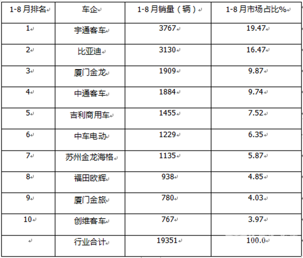---比亚迪、宇通累计销量均超出3000辆共同领跑行业(分别销售3767辆和3130辆),分别居第一、第二,市场占比分别为19.47%、16.47%;