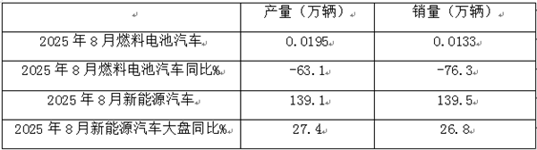 截图1,2025年8月燃料电池汽车及新能源汽车产销同比(数据来源:中汽协)