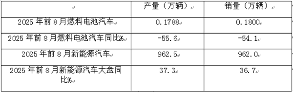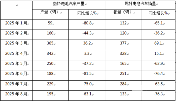 表1,根据中汽协数据,2025年前8月燃料电池汽车产量同比统计: