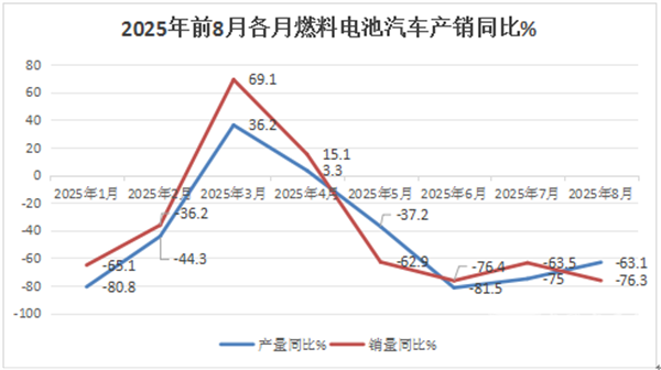 根据中汽协数据,2025年8月我国燃料电池汽车产销分别为195辆和133辆,同比分别下降63.1%和76.3%。