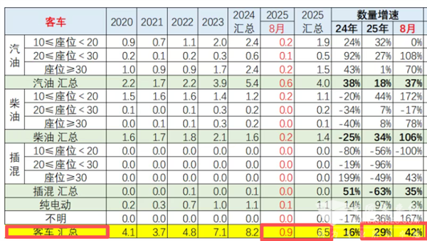 表1,2025年8月及前8月各动力客车出口数量及同比增长(数据来源:截图2)