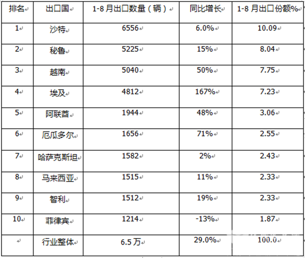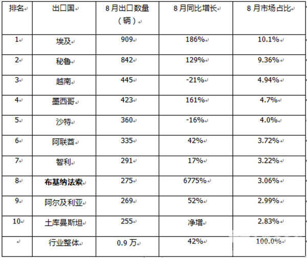 上表显示,2025年8月我国客车出口到TOP10国家中,出口数量同比及市场占比: