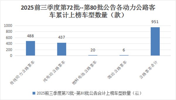 2、2025年前三季度告交通部发布的9个批次公告客车达标公告各动力车型累计上榜数量统计如下(数据来源:交通部):