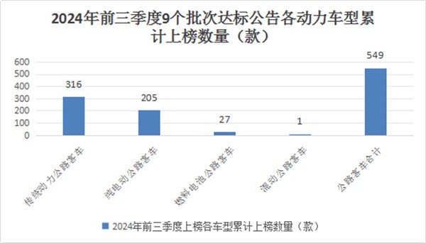 3、2024年前三季度达标公告中各动力车型累计上榜数量统计: