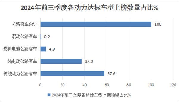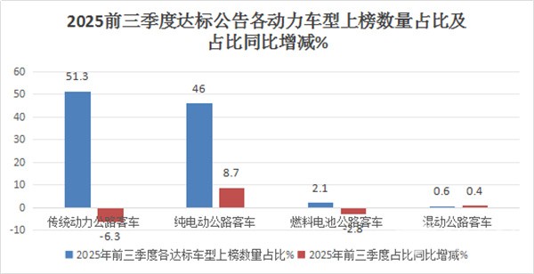 从图12、图13及图14可知,在2025年前三季度公路客车达标公告中,各动力车型上榜数量同比及占比呈现以下特征: