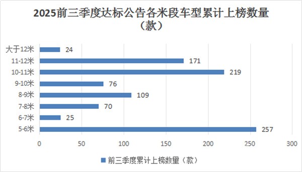 从上图表可见,2025年前三季度公路客车达标公告中各长度段车型上榜数量同比及占比呈现以下突出特征: