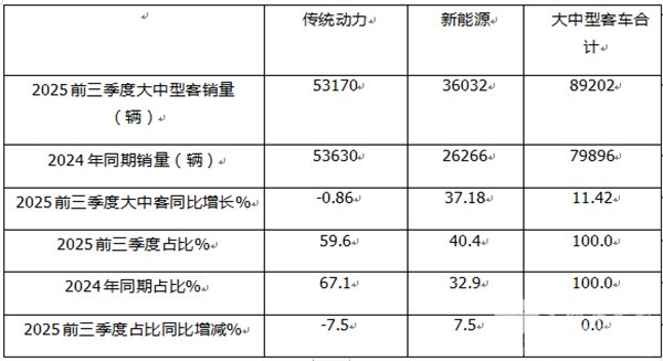 根据中国客车统计信息网数据,2025前三季度我国大中型客车累计销售89202辆,同比增长11.42%;其中传统动力、新能源大中型客车销量及同比、占比、占比同比增减统计如下表: