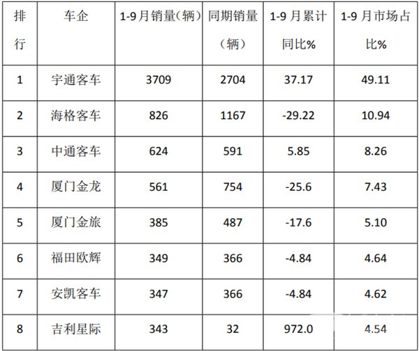 - 9月客车终端市场:中客电动化率最高 宇通\江铃分获大中客\轻客冠军