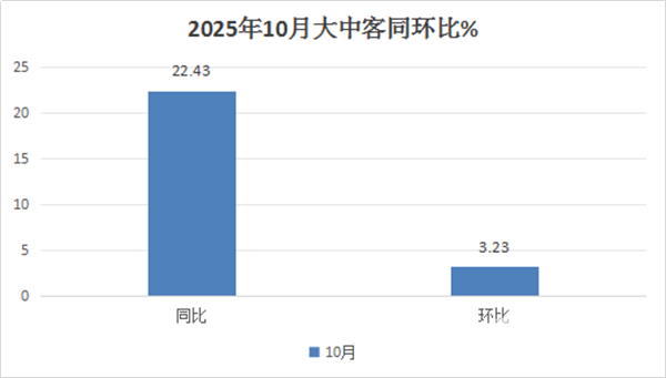 根据中国客车统计信息网数据,2025年10月我国6米以上客车销量13326辆,同比增长22.43%,环比增长3.23%。可见今年10月大中型客车市场呈现了同环比“双增长”的发展态势,说明作为客车行业传统旺季“银十”市场的火热,且胜过上月的“金九”!