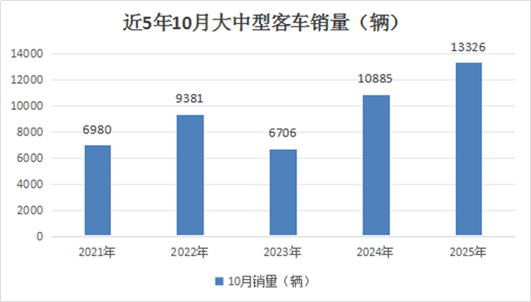 上图显示,2025年10月我国大中型客车销售13326辆,居今年前10月各月销量第一(也是今年以来第5个销量超万辆的月份),属于最高水平,在当前不算太好的经济大环境中,能有如此的市场表现已属不易。说明客车行业基本面保持稳定,市场活力持续释放。主要原因上文已经简析。