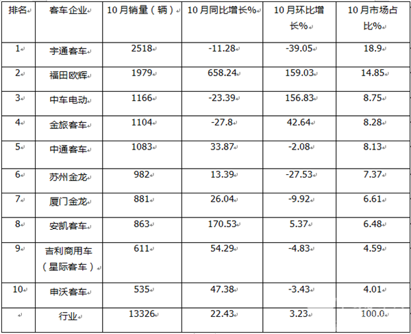 10月大中客车:宇通霸榜 中车杀入前三 欧辉“双领涨”