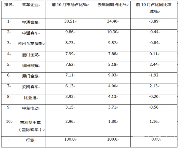 五、从前10月市场占比及占比同比增减看,TOP10占比同比4增6减,福田欧辉增加最多