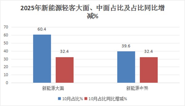 由于新能源轻客包含新能源大面(含5.5米以上新能源轻客)及中面(含4.5米--5.5米新能源轻客)车型。根据终端上牌数据,2025年10月新能源轻客中的新能源大面及中面销量及同环比、占比及占比同环比增减: