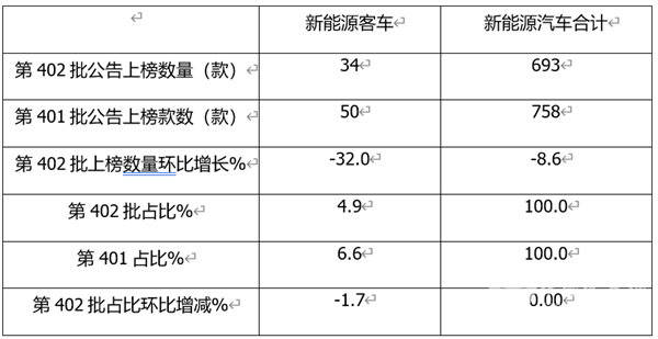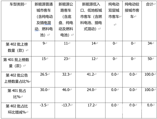 表4,根据第402批公告数据,按目标用途划分上榜的款新能源客车车型类别结构占比及占比环比增减统计: