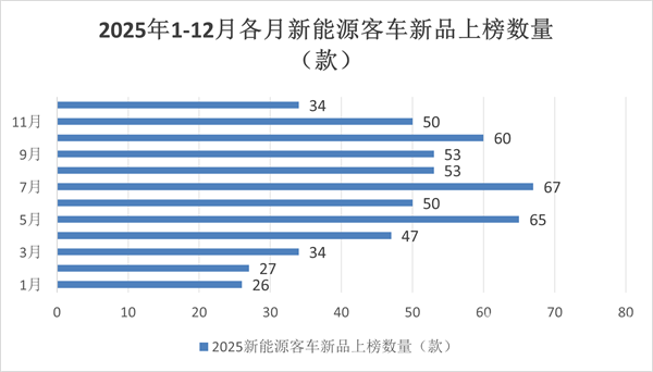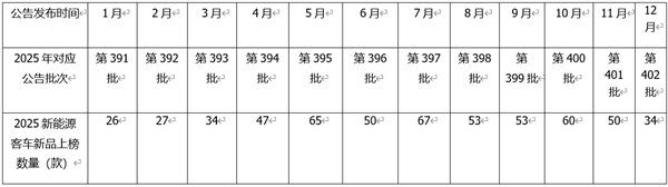 上图表显示,2025年12月工信部发布的第402批公告中,上榜新能源客车新品34款,居今年以来各月第九(与3月份并列第九),处于中下等水平,相对上月的申报数量有所减缓,这主要是因为2025年新能源公交老旧新能源公交淘汰更新补贴政策到年底就结束了(具体截止日期为2025年12月31日),而12月份已到年底,之前申报的新能源客车新品比较多,为了节省企业的资源,因此到年底车企申报的数量逐渐趋缓。