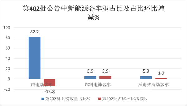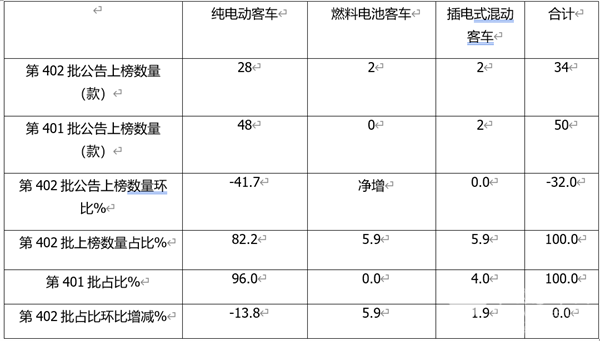 表3,根据工信部第402批公告统计数据,按技术路线划分,各车型上榜数量占比及占比环比增减:
