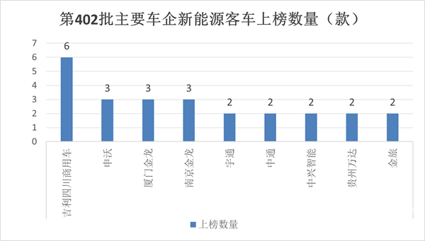 在第402批公告中有19个客车品牌企业参与了新能源客车新品申报,各个品牌上榜数量统计如下:上榜数量在2款及以上的车企品牌统计如下: