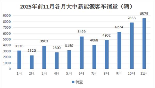 根据中国客车统计信息网数据,2025年1-11月各月我国大中型新能源客车销量: