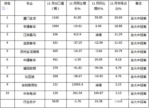 11月客车出口:销5635辆!同比降环比增,金龙\宇通争冠