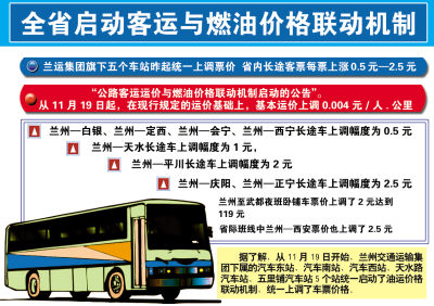 记者11月19日了解到,兰运集团旗下5家车站当天起开始执行调整后的车票价格,省内客票按里程每张票上涨0.5元———2.5元。而兰州公用长途车站则还没有动静。 兰运旗下5车站上调票价 11月19日上午,记者在汽车东站候车大厅看到,电子显示屏上滚动播放的不再是车票及班次信息,而是“公路客运运价与燃油价格联动机制启动的公告”。该公告指出:从11月19日起,在现行规定的运价基础上,基本运价上调0.004元/人·公里。