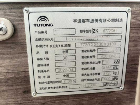 有公告东北配国六30座宇通6772营运车 2022年5月上牌,玉柴160发动机,锅炉暖气,中空玻璃,钢板减震。中型中级营运公告,木纹地板,单边行李架,旅游客运可提营运,外观内饰成色好,喜欢的来: 本公司接受客车置换(国三国四国五,非营运,旅游客运,公路客运,公交客运都可以)。我们有着丰富的外迁内地城市经验。也可做正规出口手续。我们在广东省珠三角区域(深圳、广州、珠海、佛山、东莞、惠州)从事二手车数十年,全部是薄利多销的价格出售,不管是单台还是批量•均享受最诚信的合作态度。也可以根据您需要的指定车型来优选匹配,柴油.油电混合、新能源纯电动均可在珠三角区域看到现车,各种品牌都有,油车,新能源电车,油电混合,天然气客车等,可安排师傅代驾送车,或者物流配送发往全国。我们的宗旨:不但销售的车型丰富多元化,服务更是全方位:可视频看车定车,可代驾送车。另外本公司常年收购2座-55座客车,中巴、大巴都可以操作。 公司地址:1、深圳市南山区西丽街道曙光社区云家供应链有限公司宿舍101车友汇鑫汽车贸易有限公司 2、深圳罗湖区宝岗路1号淘车吧