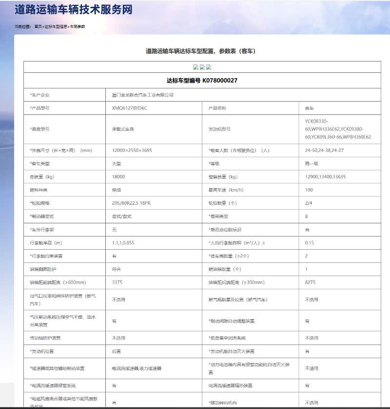 2023年6月上牌12米国六有公告50座金龙6127营运车