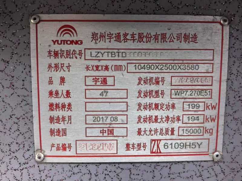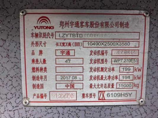 | 客车品牌 | 宇通客车 | 上牌时间 | 2017-09-13 |