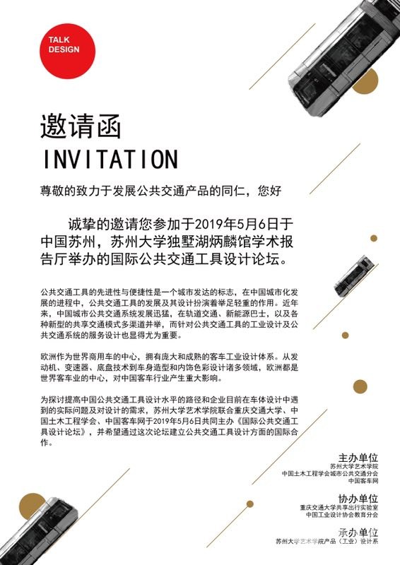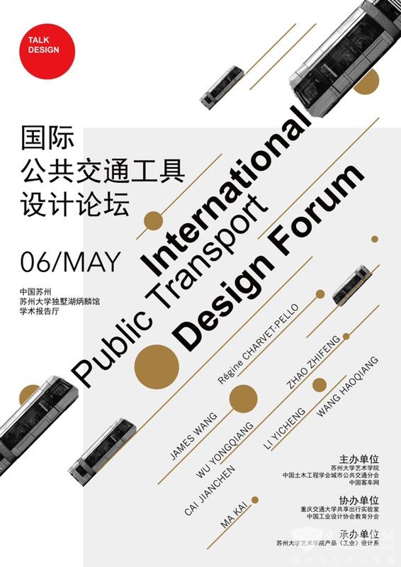 2019年5月6日,苏州大学艺术学院产品设计系联合重庆交通大学交通运输学院共享出行实验室、中国土木工程学会城市公共交通分会、XINGKONG.COM共同主办的《国际公共交通工具设计论坛》,将围绕公共交通工具设计,探讨未来公共出行方式,以及如何改变、升级现有服务产品和服务载体,旨在用设计的驱动力能够推动公共交通工具设计行业的整体水平。
