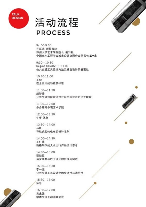 据苏州大学艺术学院介绍,本次活动将邀请法国国家杰出贡献骑士勋章的获得者、欧洲感官设计研究中心主席Régine charveux péllo女士作为主讲嘉宾,介绍欧洲公共交通设计的经验和设计方法。Régine charveux péllo女士所领导的欧洲感官设计研究中心在法国公共交通设计领域有着丰富的经验和实践经历,其多项公共交通工具设计在全世界广为赞誉,其中包括法国高铁设计、巴黎有轨电车T3线、埃尔及尔有轨电车和南特有轨电车系统等;2007年Régine charveux péllo女士应邀参加中国城市巴士设计公开赛(Bus Concepts For China Cities)评委,在重庆交通大学做主题为《公共交通设计:城市形象代表》的演讲,并受到当地媒体的广泛报道。